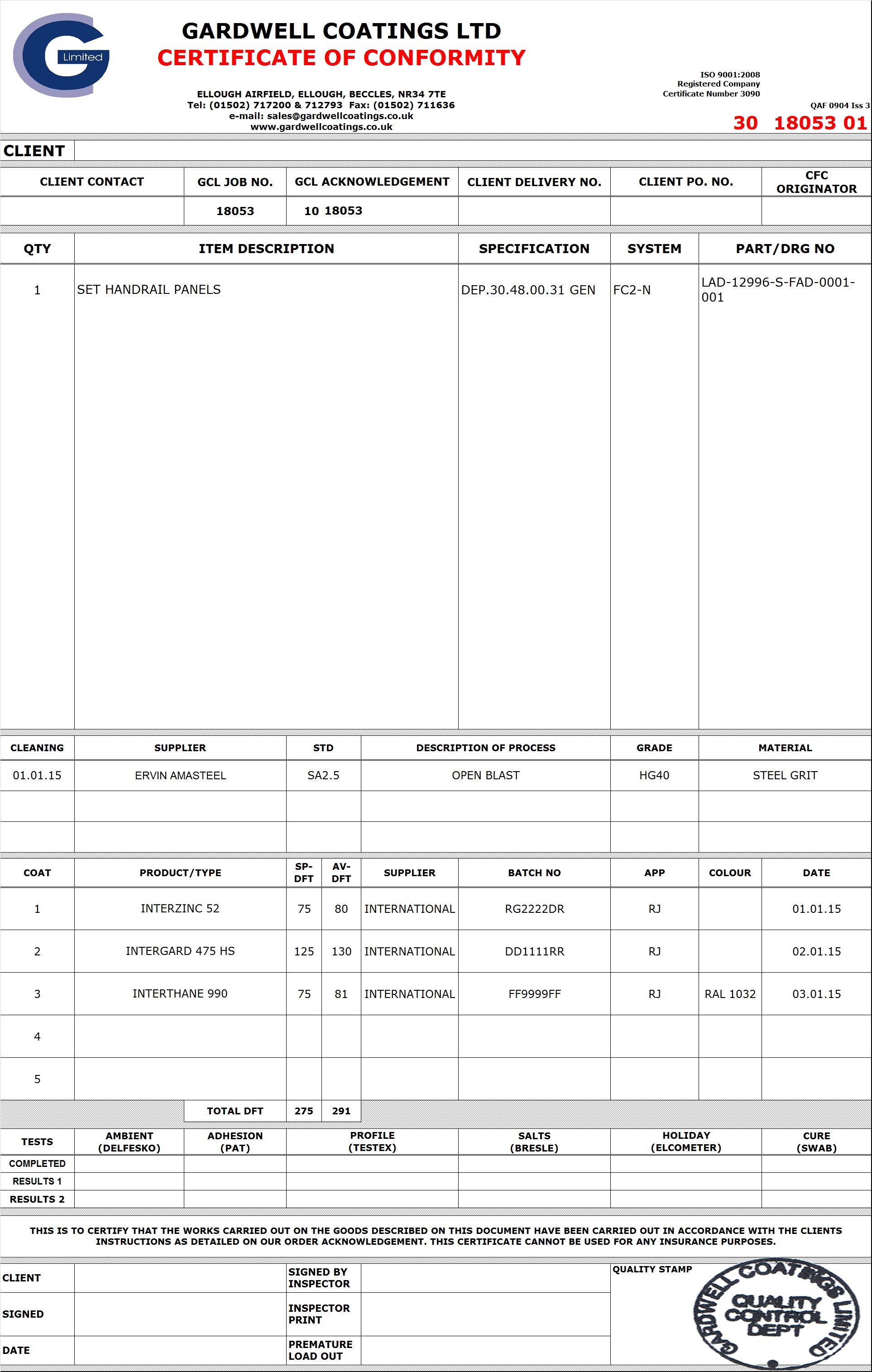 Every job no matter how small is processed and tested in a controlled environment. Every job is tested for Profile - Ambient conditions - Dry Film as a minimum. At intervals or when deemed necessary surface salts, swabs are tested.